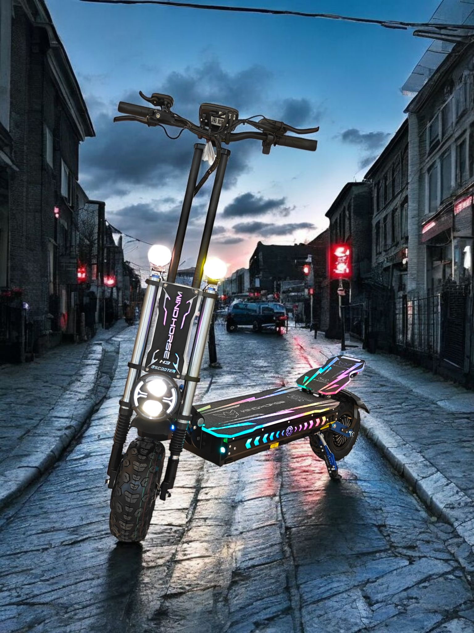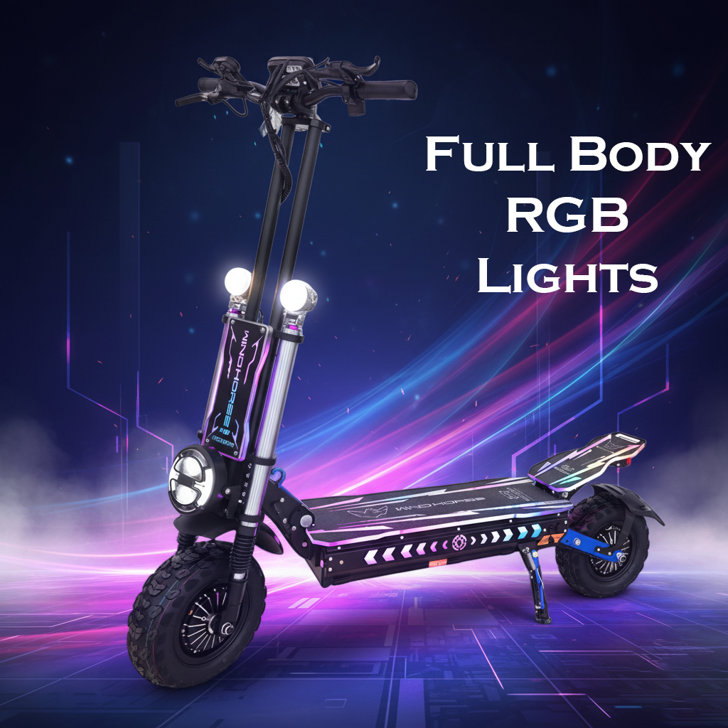 Equipped with three bright LED headlights, turn signals, and a dual suspension system, this scooter enhances visibility and ride comfort. From city streets to off-road paths, it sets a new standard for powerful and reliable electric mobility.